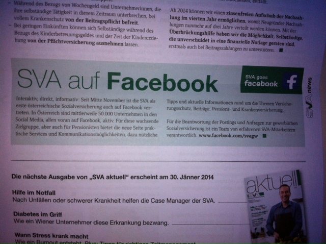 Gleich daneben: 8,38 Prozent Verzugszinsen für verspätete Beitragszahlungen sollen gesenkt werden. Auch toll! Eine gesetzliche Sozialversicherung, die wie 50.000 andere Unternehmen Facebook als Kommunikationsplattform nutzt, könnte auch schon früher festgestellt haben, dass dieser Zinssatz einer Strafe gleichkommt. Sollte das beabsichtigt sein, zeigt sich die SVA als Behörde alten Schlags, als "Obrigkeit". Wer den Pflichtversicherten Anfragen über Facebook beantwortet, kann das eigentlich nicht wollen. Verzugszinsen sollen dazu dienen, den Schaden durch verspätete Zahlung zu kompensieren, sie könnten sich also an einem Marktzins (z.B. Euribor plus 1,2 oder 3%) orientieren.