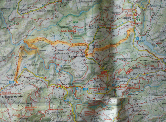 Ausgangspunkt ist Krumbach im Bregenzerwald, dieser ist mit dem Bus gut von Dornbirn oder Bregenz erreichbar. Von Hochkrumbach oder über die Wiesen und dann durch den Wald geht es zuerst hinauf zum Schweizberg. Dort musste ich schon vor 12 Uhr eine Mittagsrast einlegen, die Wiese lud einfach dazu ein dort zu verweilen. Vorbei an Höfen geht es hinunter nach Langenegg, übrigens ein Dorf mit eigener Währung und zahlreichen ausgeschilderten Energieplätzen.