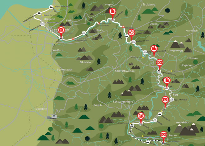 Reine Gehzeit etwa 4-5 Stunden, die Wege sind gut beschildert und viele Varianten sind möglich. Als Start oder Ziel kann auch Langenegg in der Mitte für die halbe Strecke gewählt werden, dort sind übrigens nicht zuletzt wegen der eigenen Dorfwährung mehrere Gasthäuser und ein Dorfladen wieder aufgelebt.
